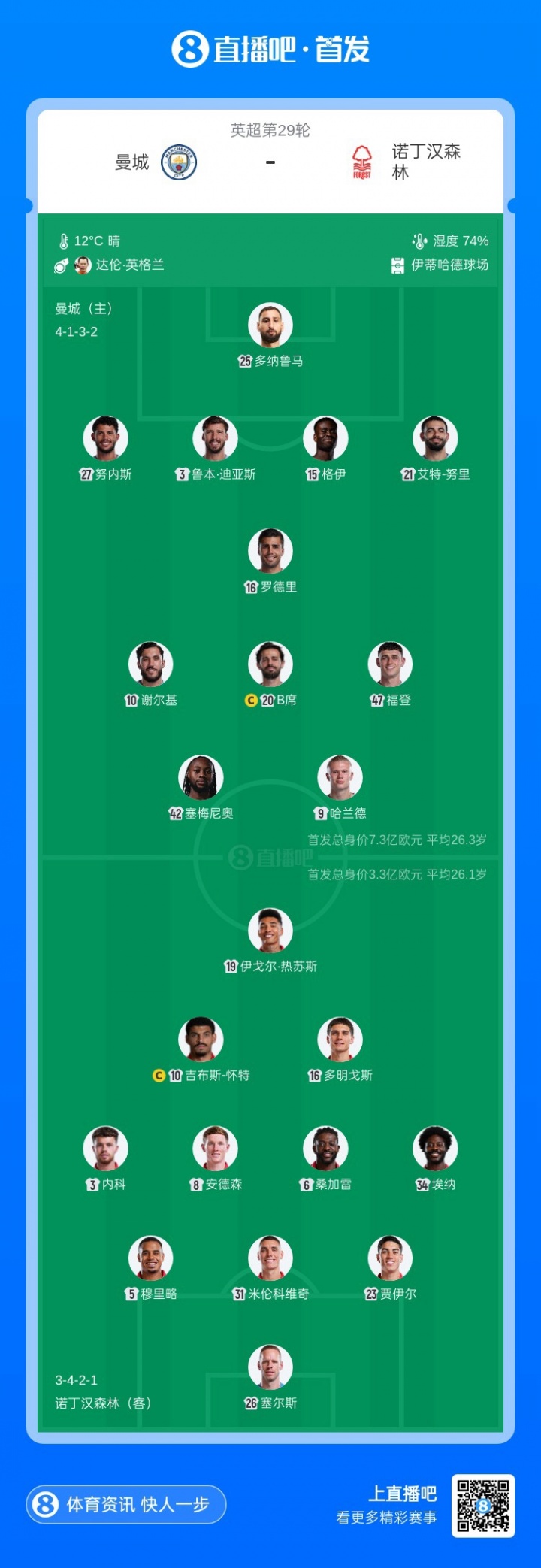 直播吧3月5日訊 英超第29輪,曼城對(duì)陣諾丁漢森林,賽前首發(fā)公布。哈蘭德、福登、塞梅尼奧先發(fā),奧賴?yán)麄薄?/p>