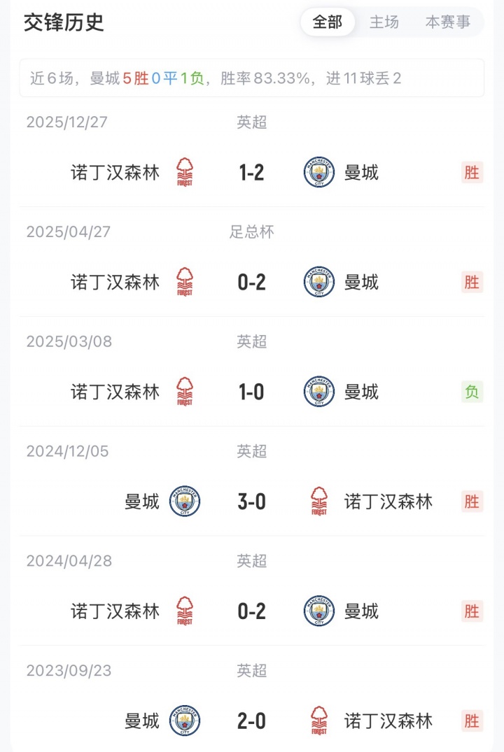 曼城暫以59分排名第二,少賽一場(chǎng)落后榜首5分。森林27分暫排第17名,只領(lǐng)先降級(jí)區(qū)2分。