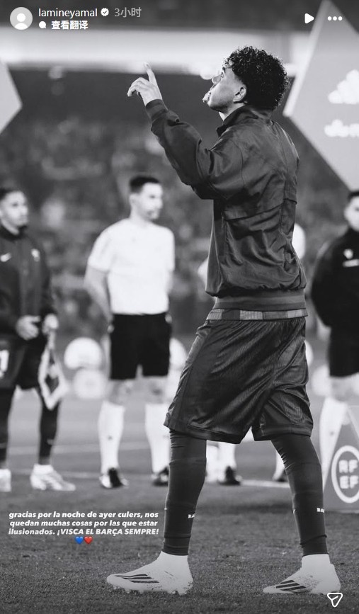 直播吧3月5日訊 國王杯半決賽,巴薩總比分3比4不敵馬競,遺憾出局。賽后,亞馬爾更新社媒感謝球迷,并鼓勵球隊。