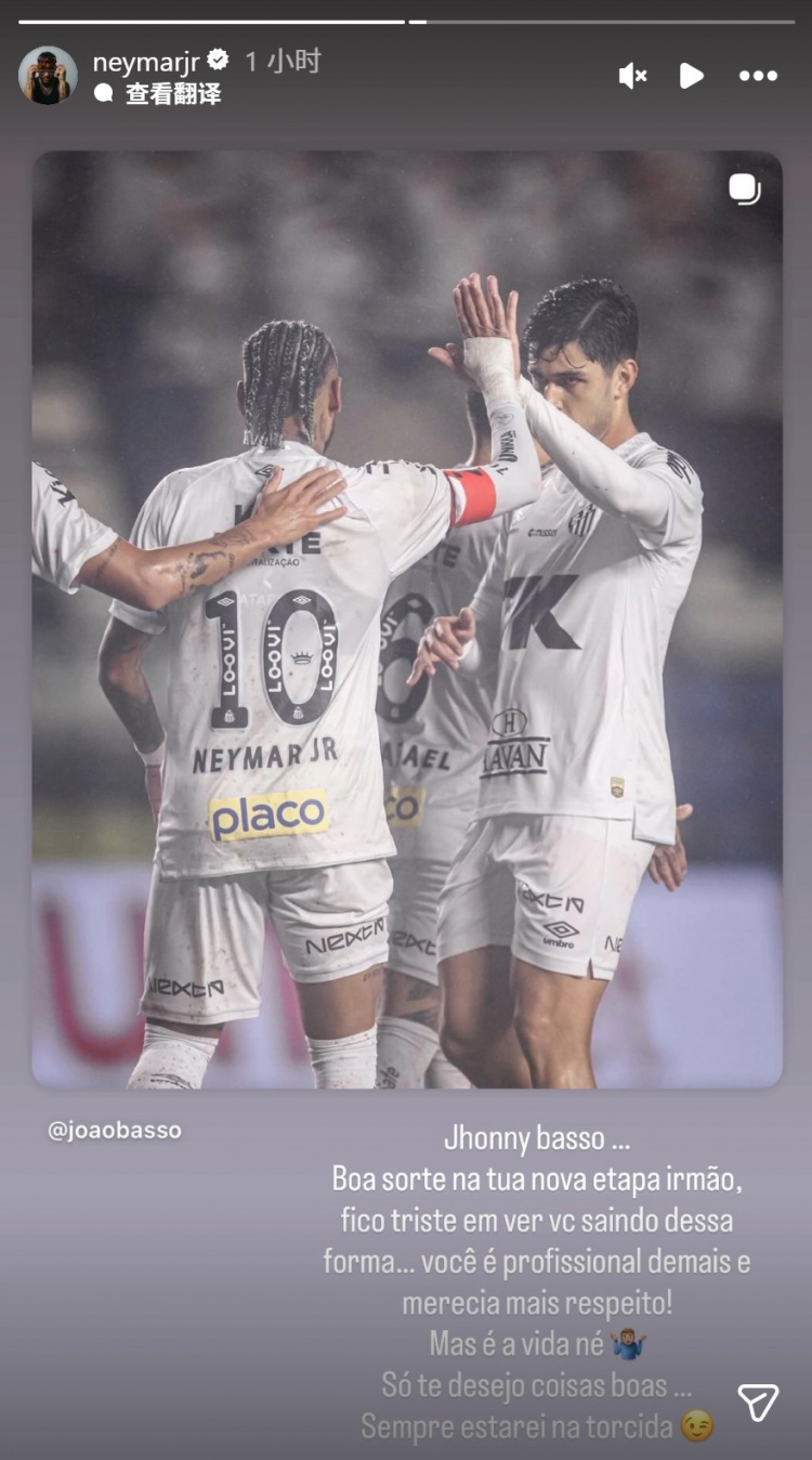 直播吧3月5日訊 內(nèi)馬爾更新社媒動(dòng)態(tài),與桑托斯解約球員若昂·巴索告別。