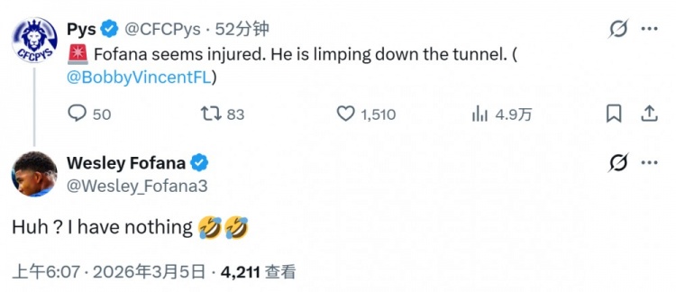 此役韋斯利·福法納為切爾西首發(fā)出戰(zhàn),有媒體稱這位切爾西后衛(wèi)看起來受傷了,走進球員通道時一瘸一拐,但福法納社媒辟謠,他表示:“嗯?我沒事?!?/p>