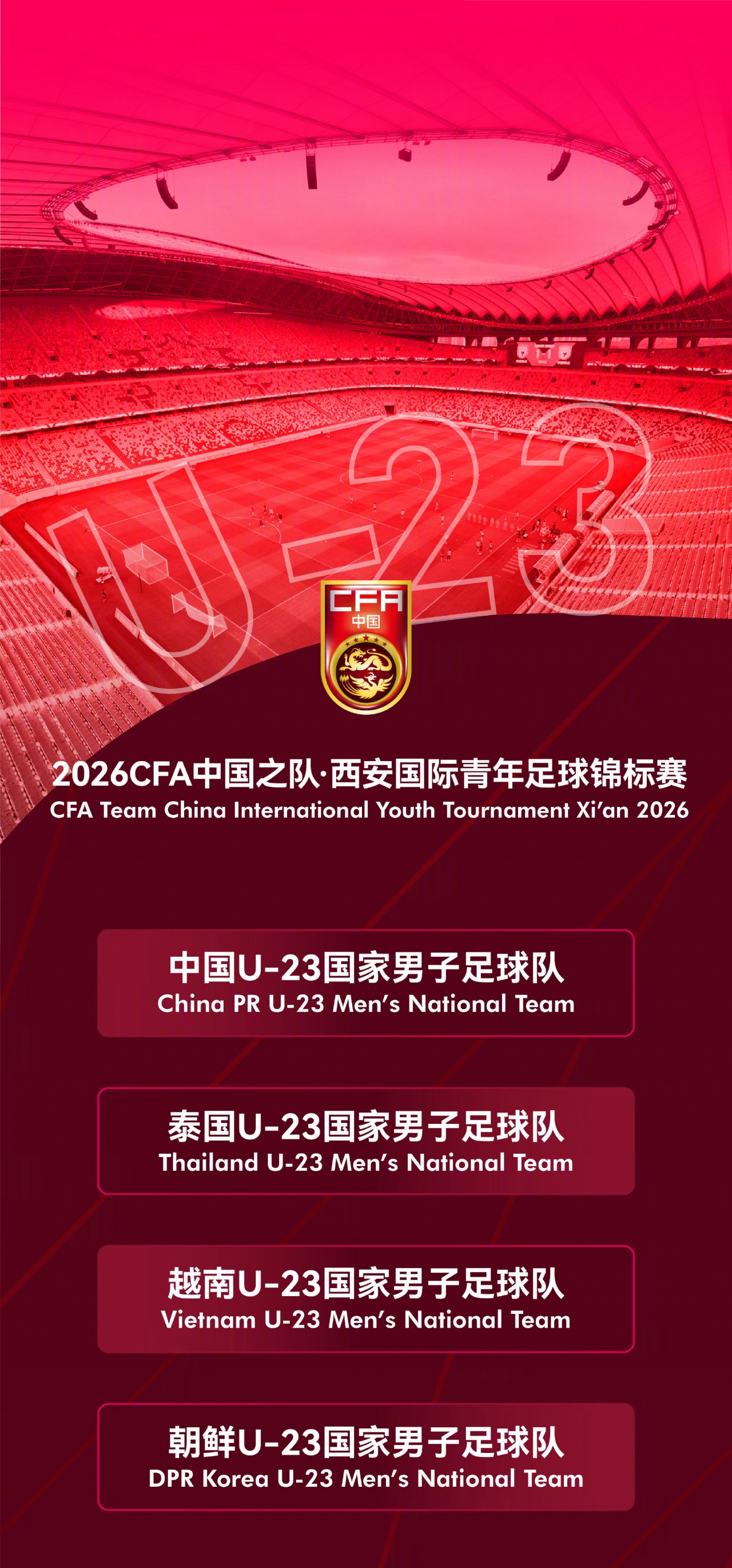 2026中國之隊·西安國際青年足球錦標賽將于3月25日至31日在西安進行。由于伊朗U-23國家男子足球隊因故退出,經(jīng)組委會決定,邀請越南U-23國家男子足球隊替代伊朗U-23國家男子足球隊參加本次賽事。