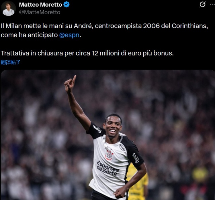 莫雷托寫(xiě)道:“AC米蘭已基本敲定來(lái)自科林蒂安的2006年出場(chǎng)中場(chǎng)新星——安德烈。”
