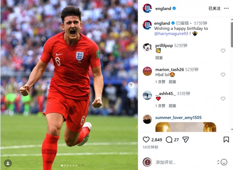 英格蘭隊(duì)官方社媒曬出馬奎爾的照片,配文:“祝馬奎爾生日快樂(lè)!”