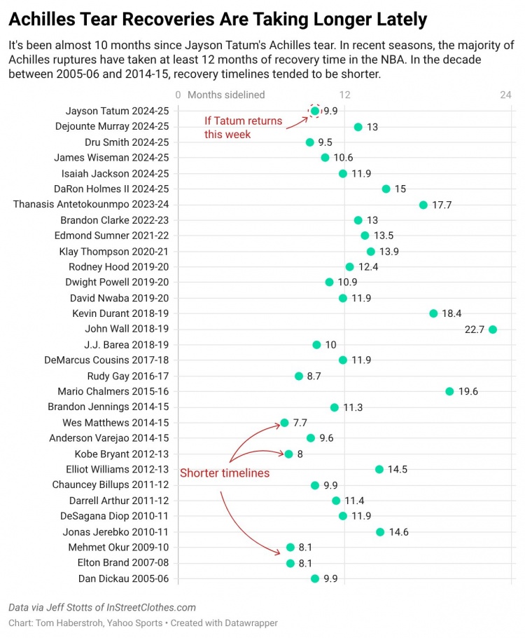 直播吧3月5日訊 雅虎體育記者Tom Haberstroh今日曬出一份球星跟腱撕裂(斷裂)傷病的恢復數據。