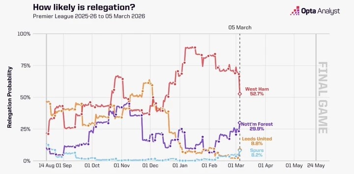 其中熱刺在賽季中期降級概率一直趨近于0,但是由于近期的糟糕表現(xiàn),目前降級概率提升至8.2%。利茲聯(lián)在賽季前期降級概率偏高,目前只有8.8%,而諾丁漢森林目前則有29.9%,西漢姆在之前一度高達80%以上,但是近期的出色發(fā)揮已經(jīng)降至52.7%。