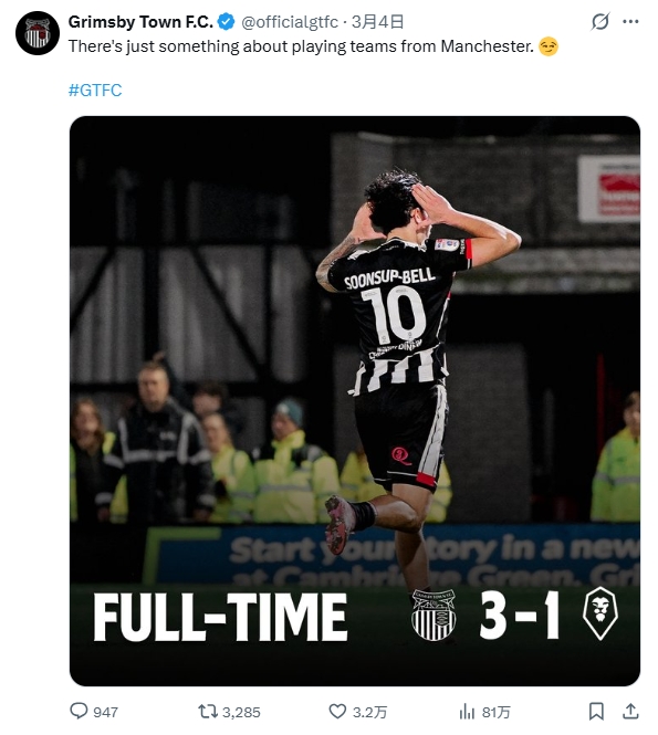 比賽結(jié)束后,格林斯比官方曬出比分圖,并且配文:“和來自曼徹斯特的球隊(duì)踢比賽真的有點(diǎn)說法的。