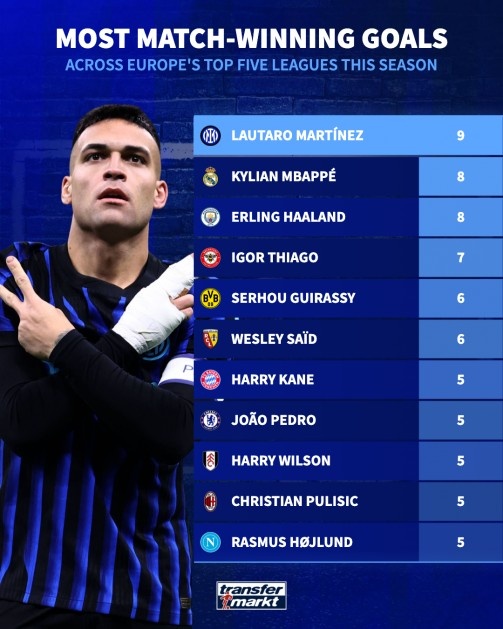 直播吧3月6日訊 德國轉(zhuǎn)會市場盤點了本賽季五大聯(lián)賽打進制勝球球員情況,勞塔羅以9球居首,姆巴佩和哈蘭德以8球并列次席。