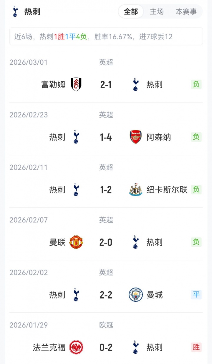 本場(chǎng)比賽前熱刺7勝8平13負(fù),積29分排名英超第16;水晶宮9勝8平11負(fù),積35分排名英超第14。