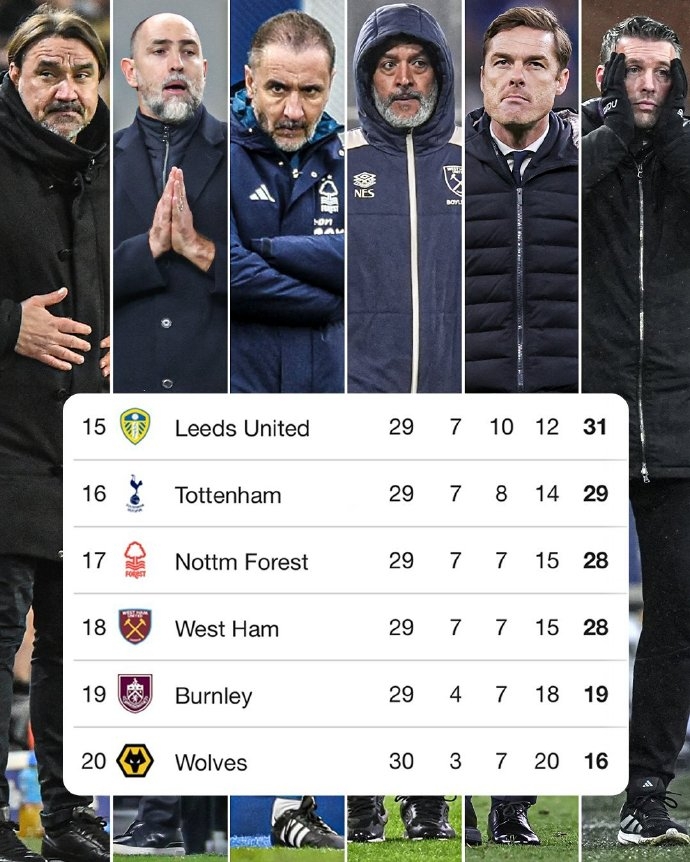 保級(jí)區(qū)方面,排名第16的熱刺29分,只領(lǐng)先第17的森林1分。目前在降級(jí)區(qū)的三支球隊(duì):西漢姆28分(與森林同分),伯恩利19分,狼隊(duì)16分。