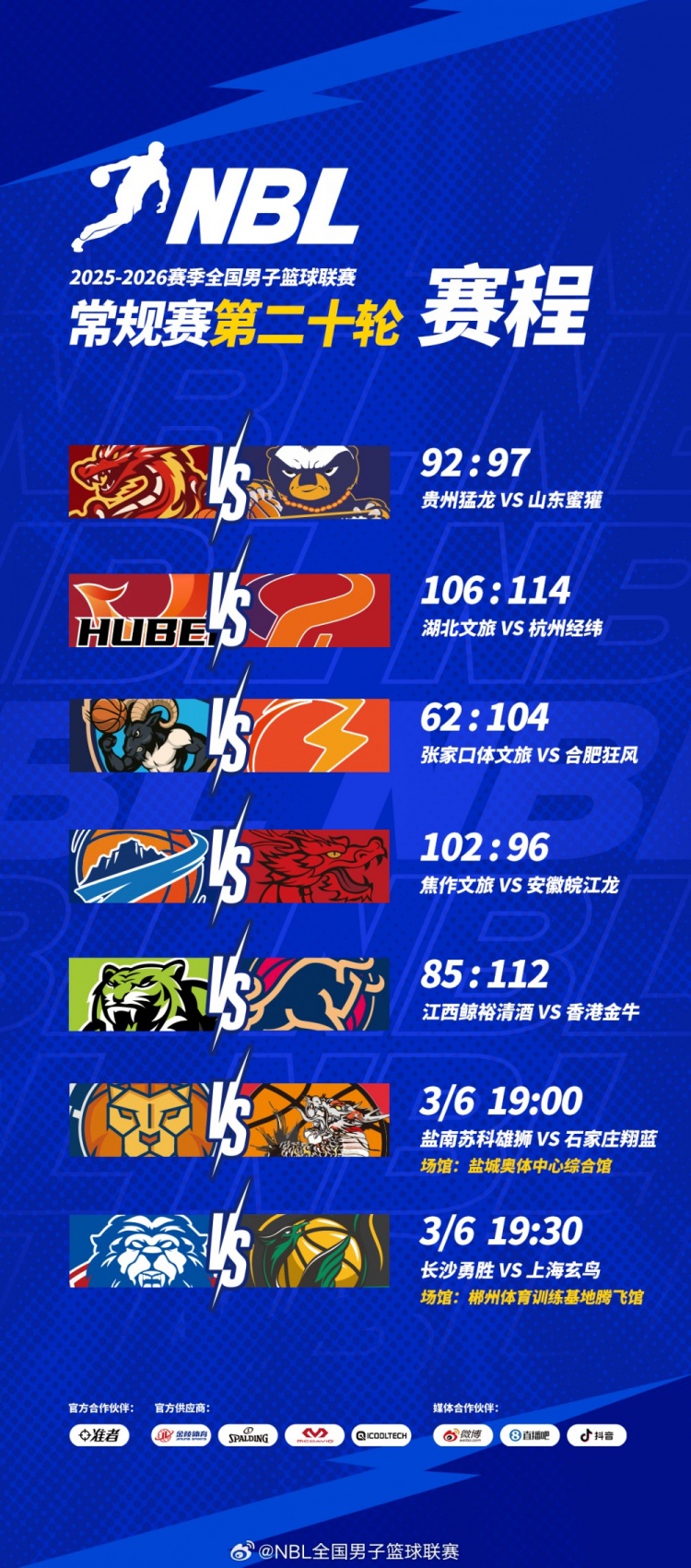 NBL常規(guī)賽第二十輪第二個(gè)比賽日,主場(chǎng)作戰(zhàn)的湖北文旅卡位戰(zhàn)不敵杭州經(jīng)緯;焦作文旅在加時(shí)賽表現(xiàn)出色,贏得與安徽皖江龍的卡位戰(zhàn)。張家口體文旅和江西鯨裕清酒均在主場(chǎng)不敵對(duì)手。