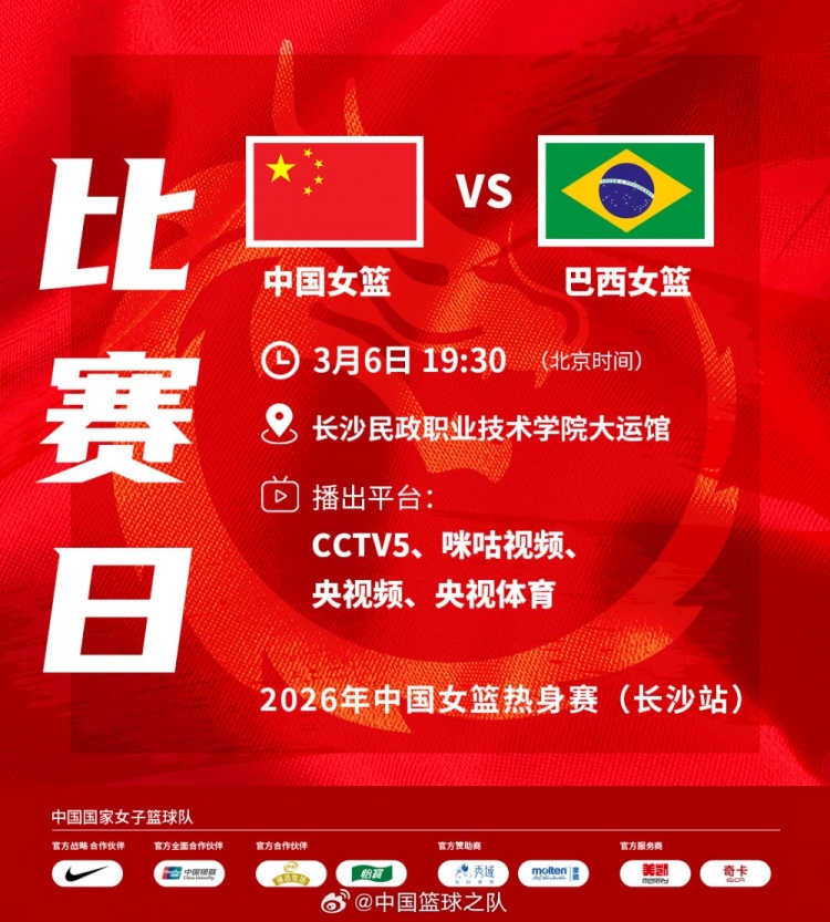 直播吧3月6日訊 中國籃球之隊發(fā)布中國女籃最新賽事信息。今晚19:30,中國女籃將在長沙繼續(xù)對陣巴西女籃。