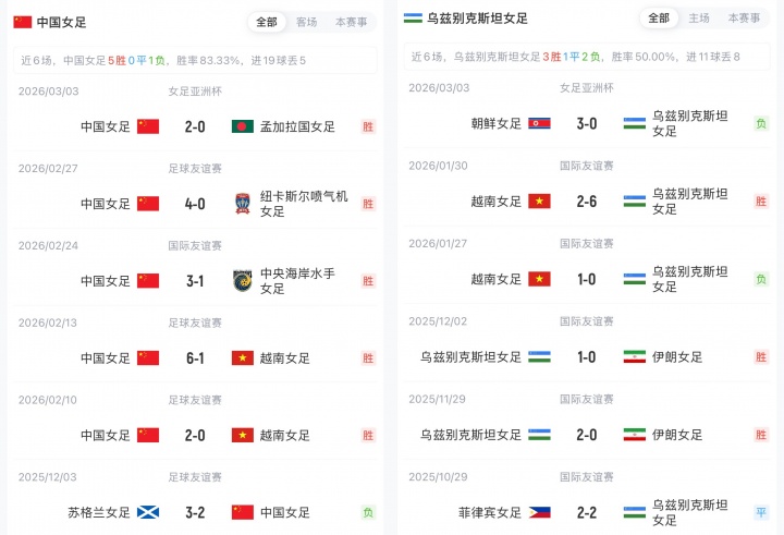 中國女足是本屆賽事的衛(wèi)冕冠軍,9次奪得亞洲杯冠軍歷史第一。目前中國女足排名FIFA第17,烏茲別克斯坦女足排名FIFA第49。小組賽首輪,中國女足2-0擊敗孟加拉國女足,烏茲別克斯坦女足0-3不敵朝鮮女足。