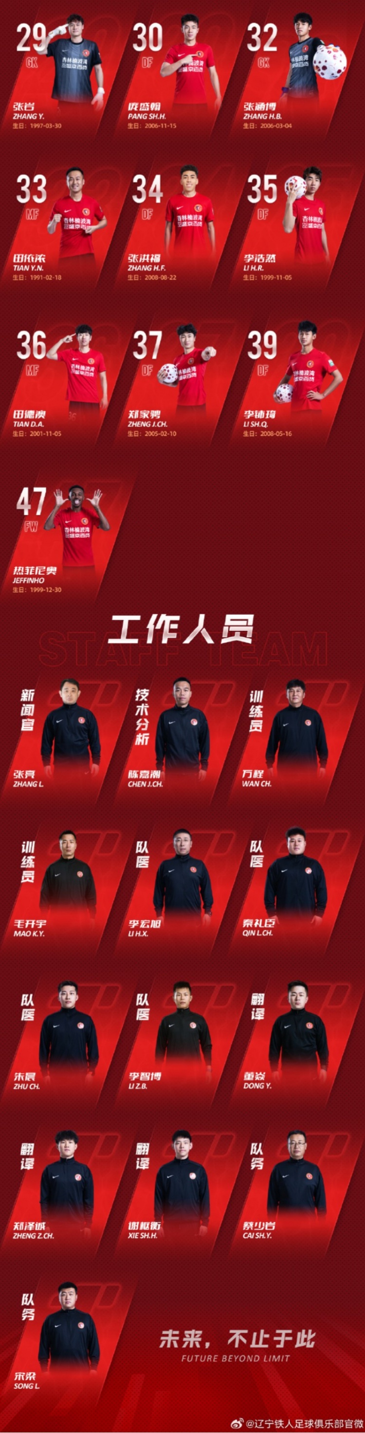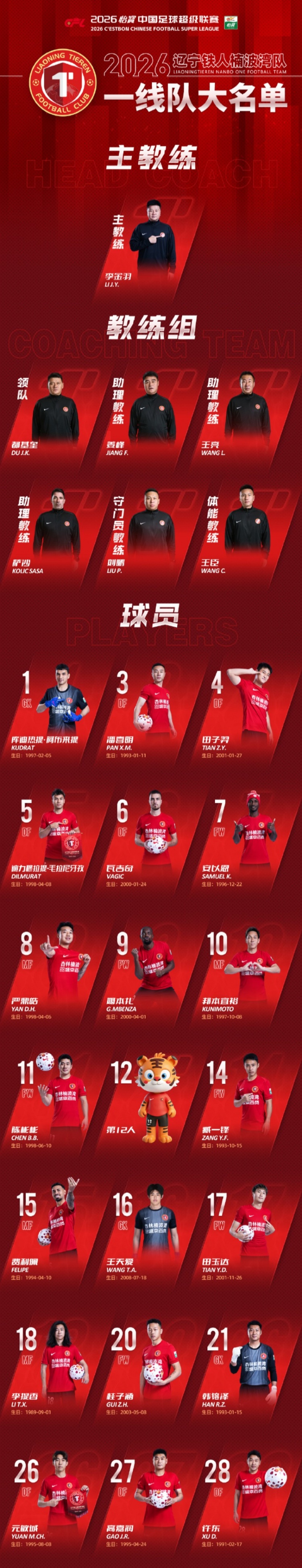 直播吧3月6日訊 中超升班馬遼寧鐵人公布新賽季一線隊(duì)球員名單,主教練李金羽,嚴(yán)鼎皓8號(hào),邦本宜裕10號(hào),張洪福34號(hào),熱菲尼奧47號(hào)。
