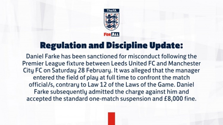 英足總發(fā)布公告:“丹尼爾·法爾克因在利茲聯(lián)對陣曼城的比賽結(jié)束后存在不當行為而受到處罰。據(jù)指控,該主教練在全場結(jié)束時進入比賽場地與裁判發(fā)生對峙,此舉違反了《足球競賽規(guī)則》第12條。丹尼爾·法爾克承認該項指控,并接受標準的一場停賽處罰,以及8000英鎊罰款。”