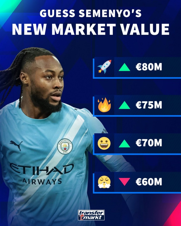 直播吧3月6日訊 德國(guó)轉(zhuǎn)會(huì)市場(chǎng)預(yù)熱曼城前鋒塞梅尼奧的最新身價(jià),他的身價(jià)最高可能達(dá)到8000萬(wàn)歐,最低6000萬(wàn)歐。