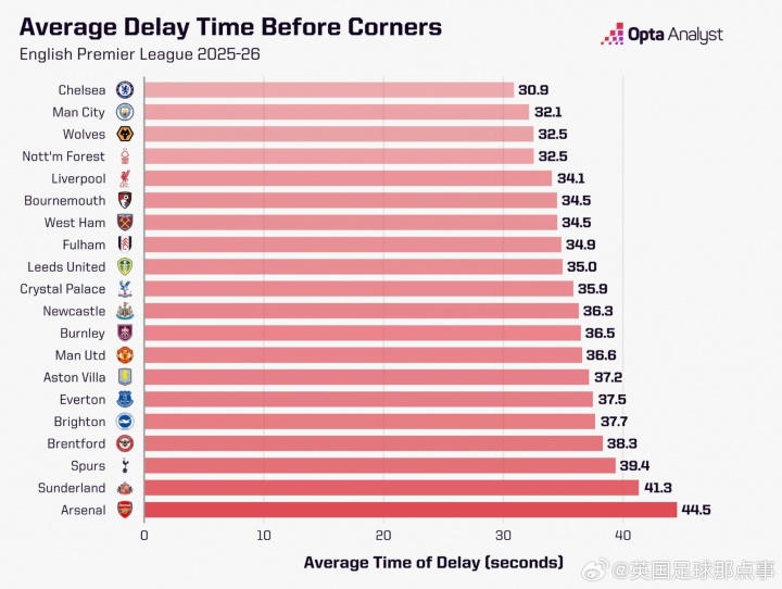 Opta統(tǒng)計2025/26賽季英超各隊角球前平均延誤時間(從少到多排序)↓
