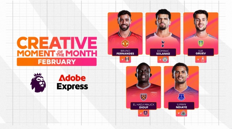 直播吧3月6日訊 2月份的英超聯(lián)賽中出現(xiàn)了許多精彩的創(chuàng)意時(shí)刻。英超官方從中挑選了五個(gè)最出色的片段進(jìn)行投票,選出本月的Adobe Express創(chuàng)意時(shí)刻。