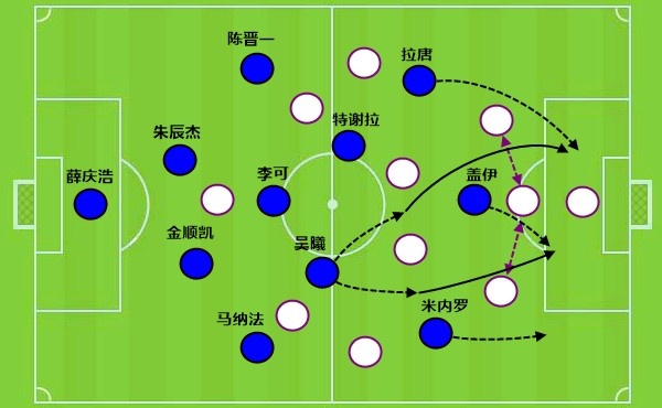 就像是這一次的反擊,當(dāng)盧永濤直塞找到安永佳時,加布里埃爾快速前插作為箭頭,這時候就需要中鋒拿得住球完成下一步的輸送,可惜安永佳被拉莫斯犯規(guī)。