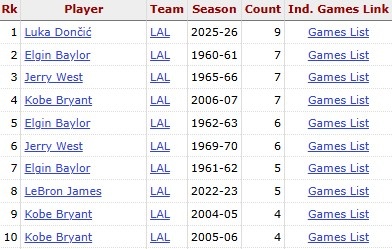 東契奇得到44分9籃板5助攻,這讓他單賽季40+5+5的次數(shù)(10次)位列湖人隊史第一。