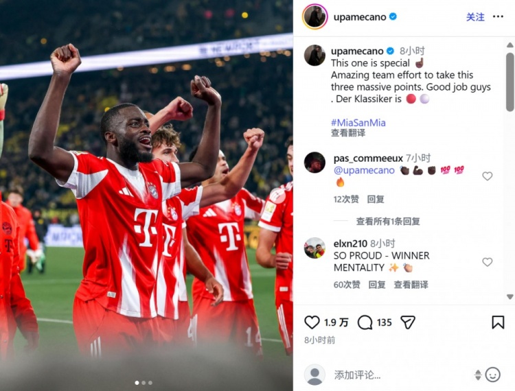 賽后拜仁后衛(wèi)于帕梅卡諾在社媒曬出球隊(duì)?wèi)c祝勝利的照片,配文寫道:“這場(chǎng)勝利尤為珍貴,全隊(duì)付出不懈的努力收獲重要的三分!大家漂亮的完成任務(wù)!國(guó)家德比勝利屬于拜仁!”