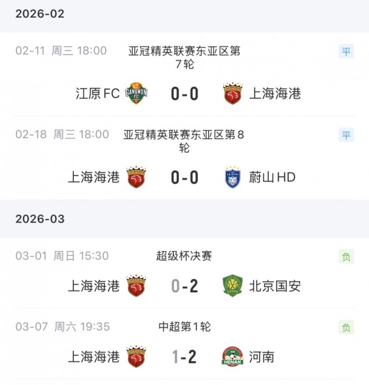 在2月中旬進行的亞冠精英聯(lián)賽東亞區(qū)最后兩輪賽事中,海港分別0-0戰(zhàn)平江原FC和蔚山HD。上周的超級杯,海港0-2不敵國安。