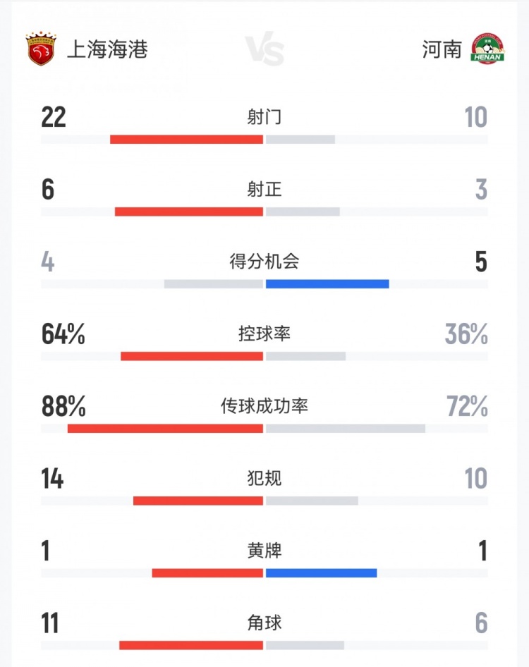 直播吧3月7日訊 中超第一輪,上海海港主場1-2河南隊。雙方全場重點數(shù)據(jù)對比如下↓(主隊上海海港在前)