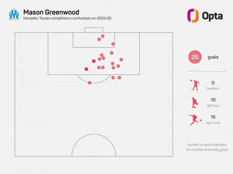 據(jù)Opta統(tǒng)計,格林伍德本賽季打進(jìn)25球,其中左腳10球,右腳15球,他是本賽季五大聯(lián)賽唯一各賽事左腳、右腳進(jìn)球皆10+球員。