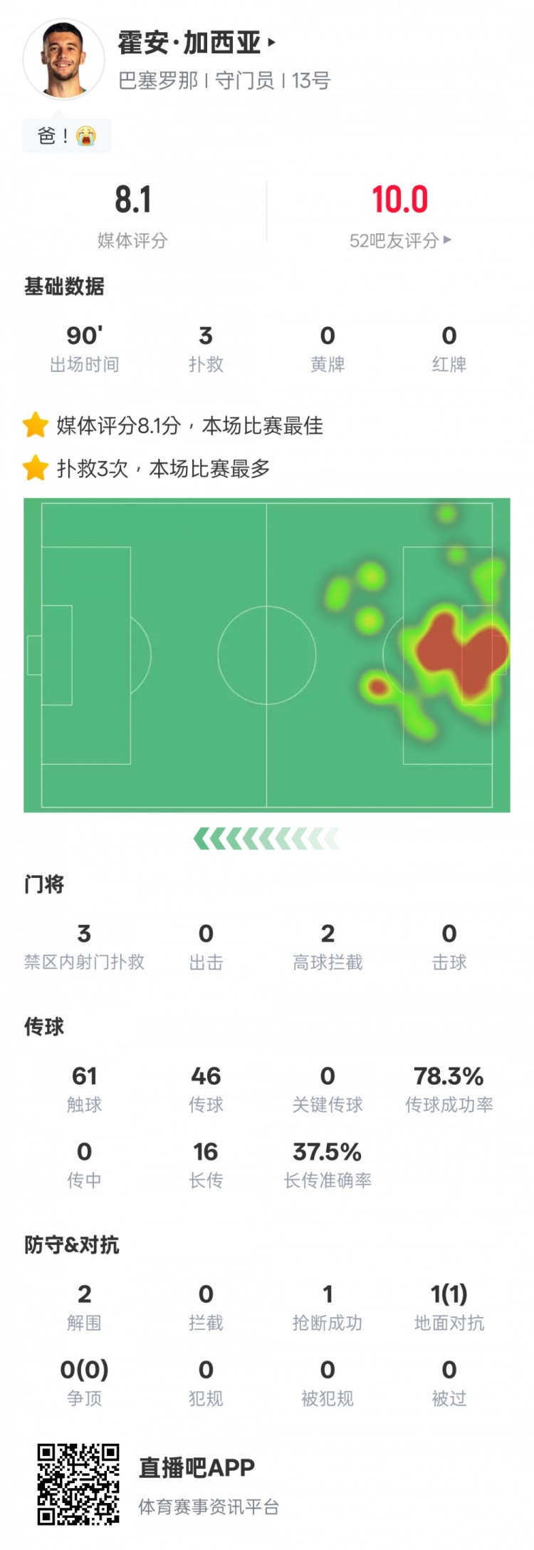 霍安·加西亞本場比賽數(shù)據(jù)如下: