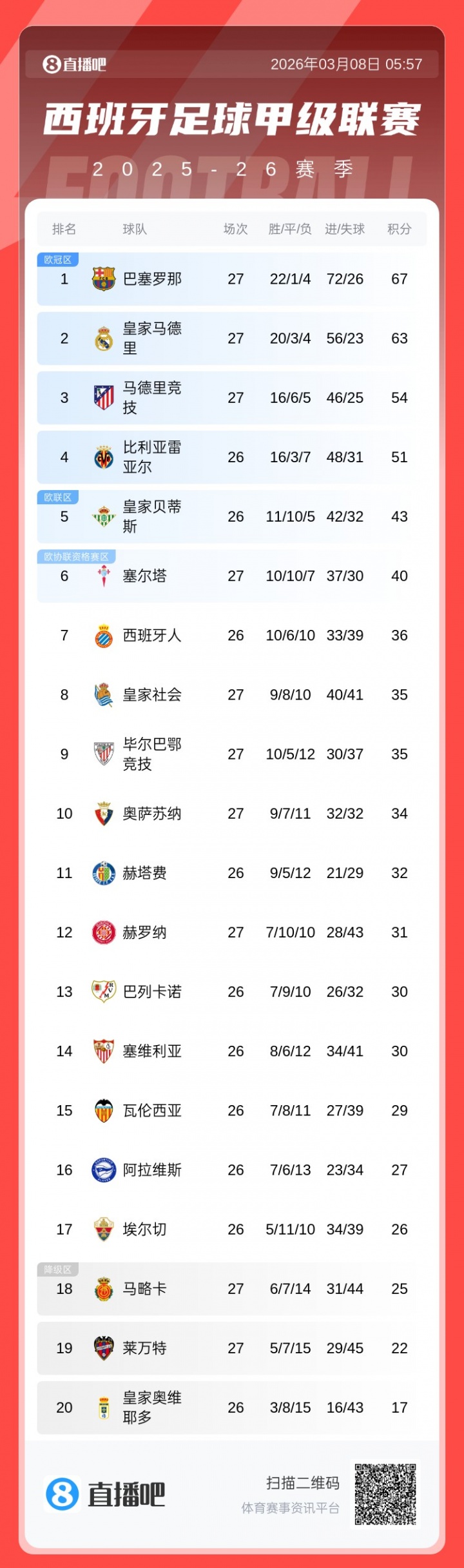 最新的積分榜形勢如下↓
