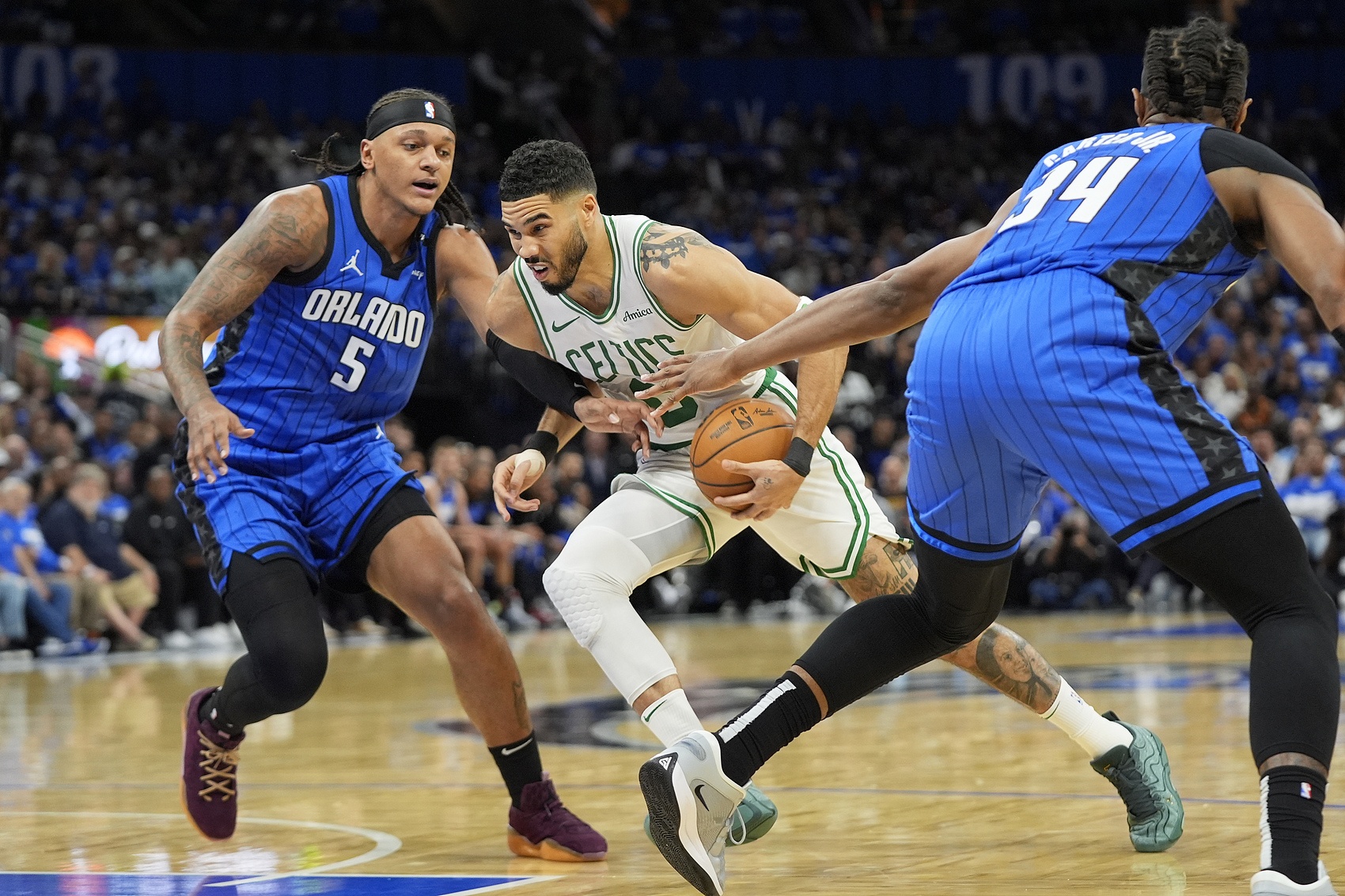 本場(chǎng)比賽,魔術(shù)前鋒班凱羅穩(wěn)定發(fā)揮,出場(chǎng)34分鐘18投10中,三分5中1、罰球4中4砍下25分15籃板3助攻,也有5失誤,正負(fù)值+15。