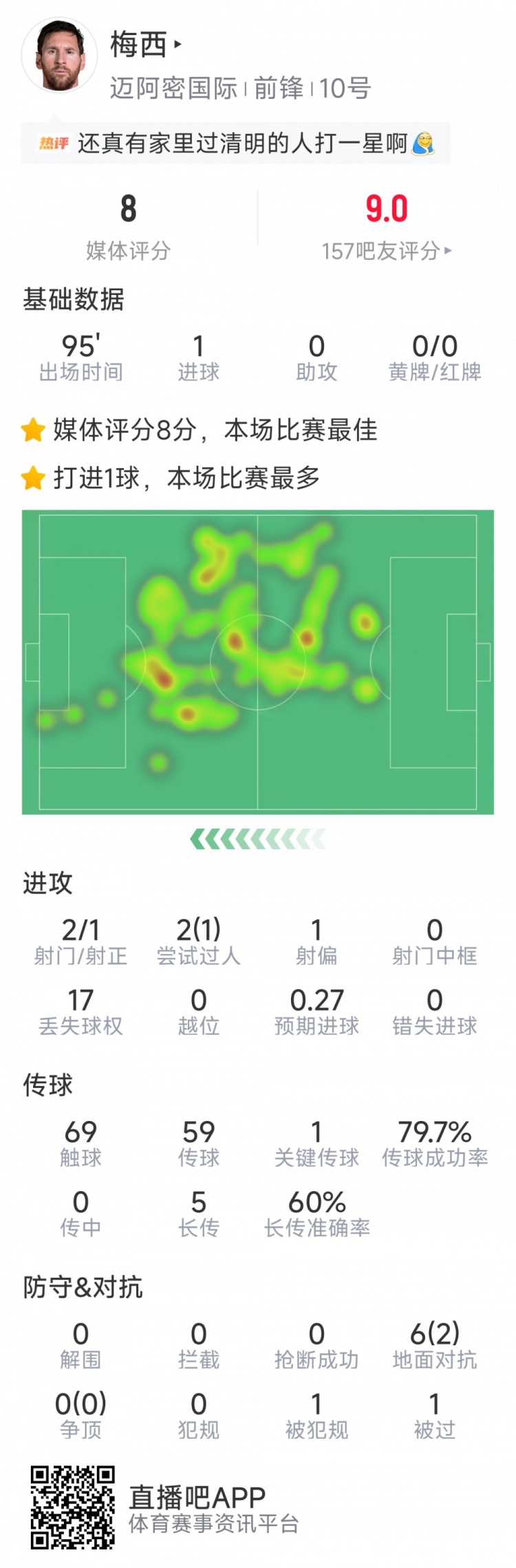 直播吧3月8日訊 在本輪美職聯(lián),邁阿密國際2-1擊敗華盛頓聯(lián),以下為梅西全場數(shù)據(jù):
