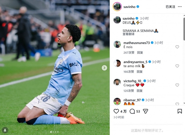 薩維尼奧當(dāng)選此役隊(duì)內(nèi)最佳球員,他在社交媒體上曬出慶祝進(jìn)球的照片,配文:“感謝上帝,一周一周穩(wěn)扎穩(wěn)打?!?/p>