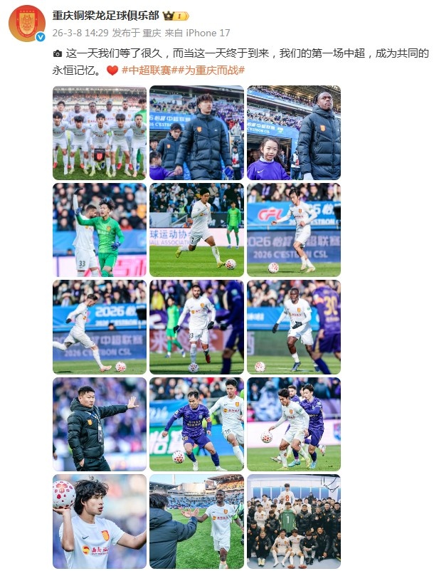 比賽結(jié)束后,重慶銅梁龍官方發(fā)布圖集,紀(jì)念球隊(duì)的第一場中超,球隊(duì)同時(shí)配文表示“這一天我們等了很久,而當(dāng)這一天終于到來,我們的第一場中超,成為共同的永恒記憶”。