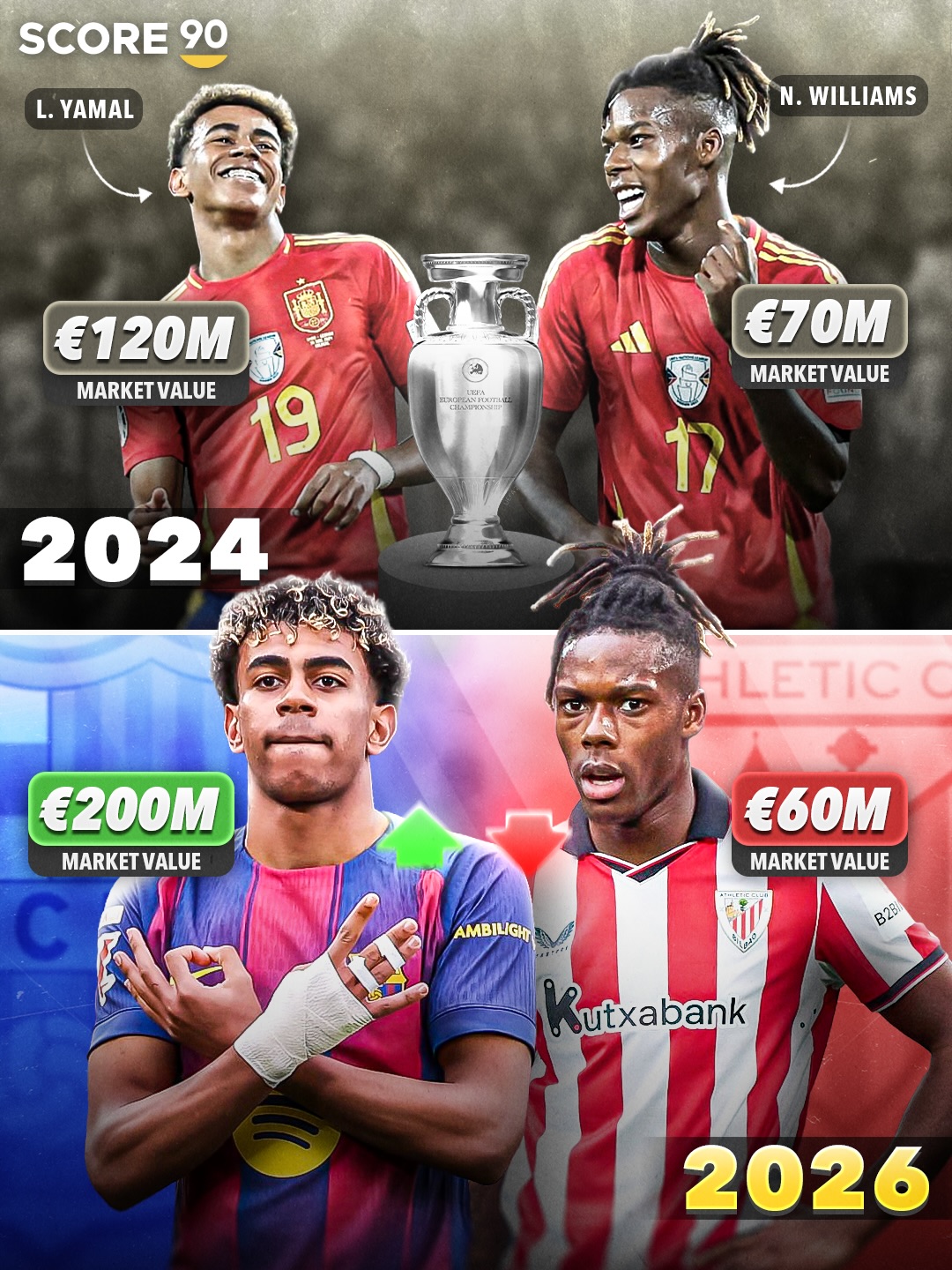 目前18歲的亞馬爾德轉(zhuǎn)身價已經(jīng)高達(dá)2億歐元,貴為當(dāng)今足壇身價第一;而23歲的尼科在上升期卻遭遇了身價下跌,目前的身價已經(jīng)跌到了6000萬歐元。
