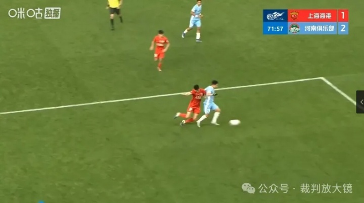分析劉祝潤(rùn)的進(jìn)球我們先看一下魏震防守時(shí)疑似從身后撞到何超,VAR核查后沒(méi)介入,海港發(fā)出球門(mén)球后,形成了劉祝潤(rùn)的這個(gè)進(jìn)球,一來(lái)一回,兩個(gè)關(guān)鍵判罰。