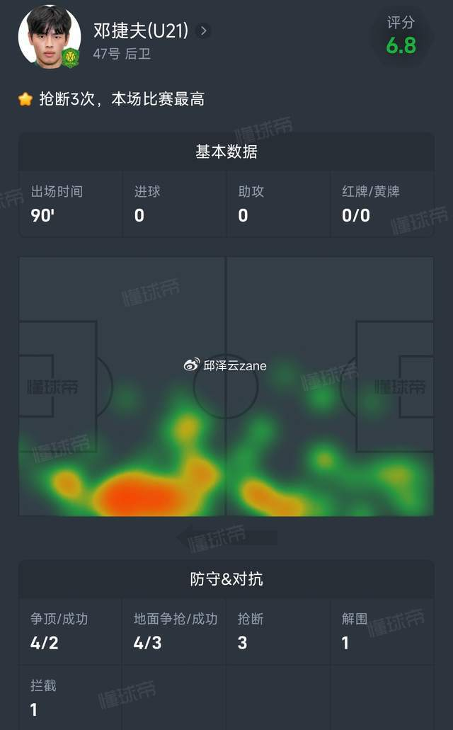 第一個(gè),能被國安新任主帥、上賽季英超熱刺助教蒙哥馬利第一場就安排首發(fā),果然是有點(diǎn)東西的。鄧捷夫今晚中超首發(fā)并踢滿全場,3次搶斷全場最高,還有1次解圍,1次攔截,3次地面爭搶成功和2次爭頂成功,這數(shù)據(jù)對于18歲小將的首秀簡直是驚艷了!