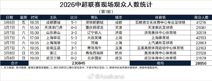 直播吧3月9日訊 德轉(zhuǎn)管理員朱藝統(tǒng)計(jì)2026中超聯(lián)賽第一輪現(xiàn)場觀眾人數(shù),以下是具體信息。