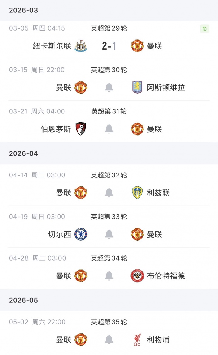 曼聯(lián)由于無緣歐戰(zhàn)賽事,并且在聯(lián)賽杯和足總杯中雙雙出局,賽程明顯減少。他們的下一場比賽要到3月15日才會進(jìn)行,對手是阿斯頓維拉,之后,他們將在3月21日對陣伯恩茅斯。