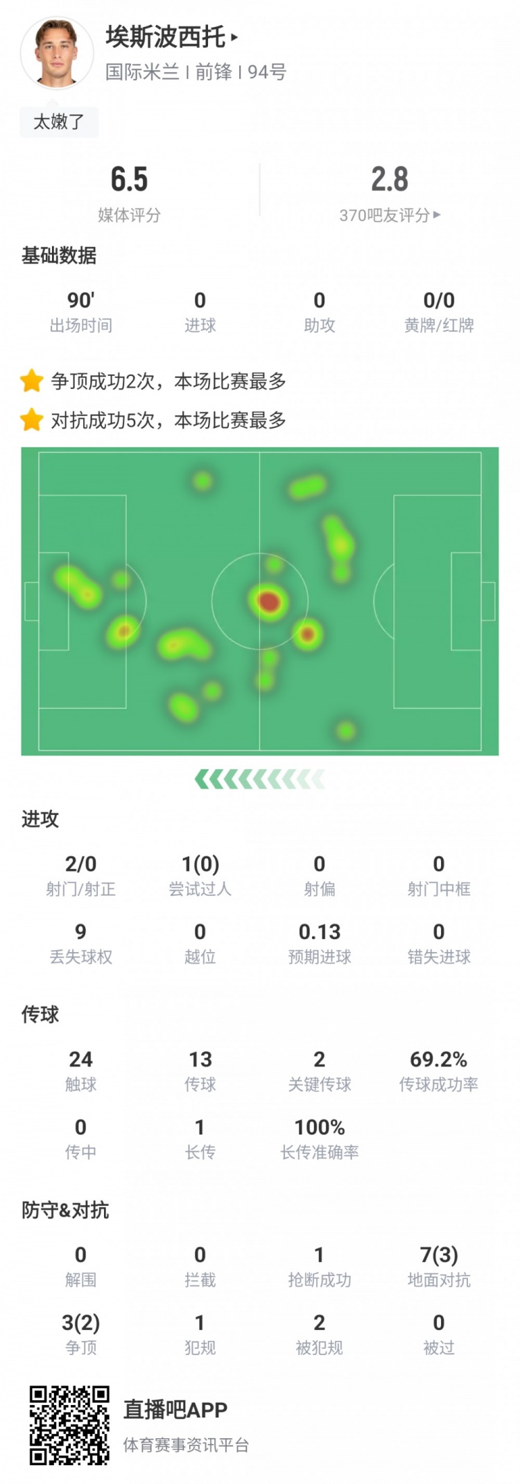 直播吧3月9日訊 國米在本輪意甲0-1輸給米蘭,以下是首發(fā)出場的皮奧·埃斯波西托的全場數(shù)據(jù)。