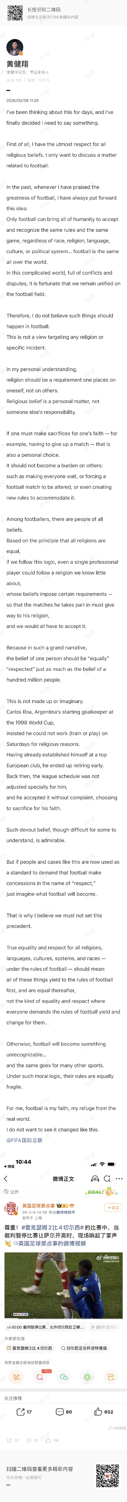 黃健翔中英雙語(yǔ)發(fā)文,并艾特了國(guó)際足聯(lián)賬號(hào),談到了這件事。