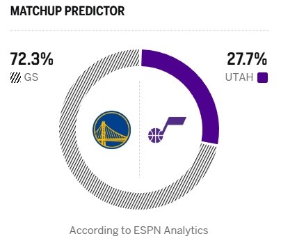 今日ESPN給出本場(chǎng)勝率預(yù)測(cè),勇士高達(dá)72.3%,爵士只有27.7%。