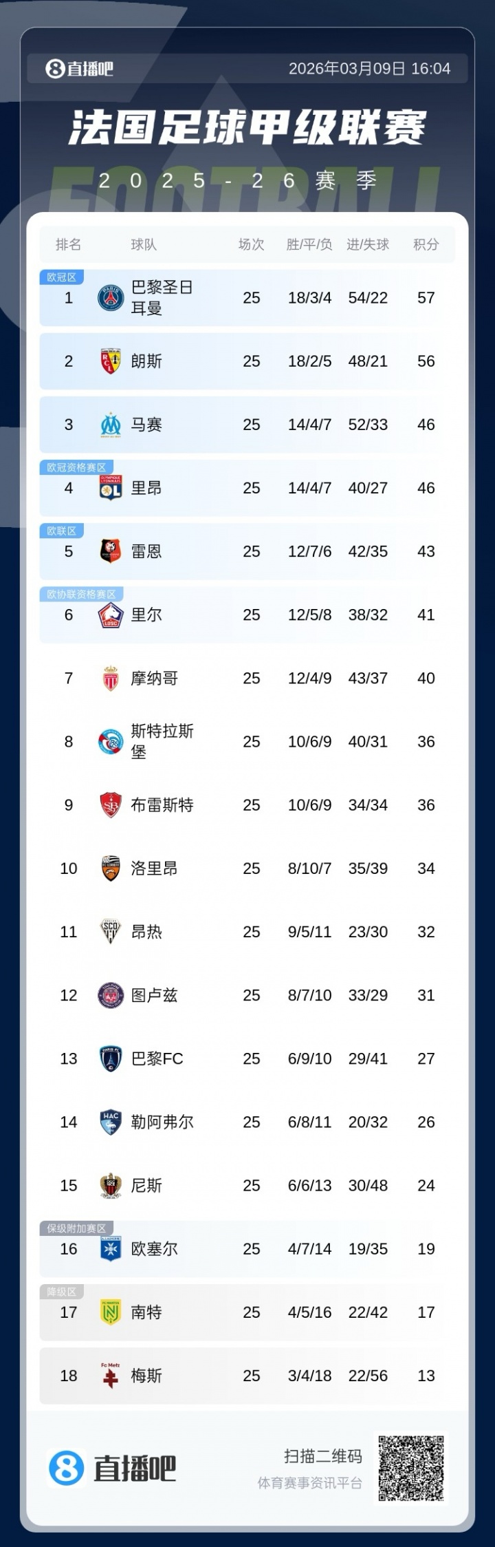 法甲:1分(巴黎57分;朗斯56分)