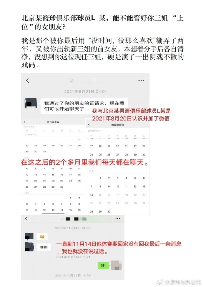 直播吧3月9日訊 網(wǎng)名@城市喂雞日常在今年的2月曬出多張圖片,表示北京某籃球俱樂(lè)部的球員L某劈腿,還被這位L某的小三騷擾。