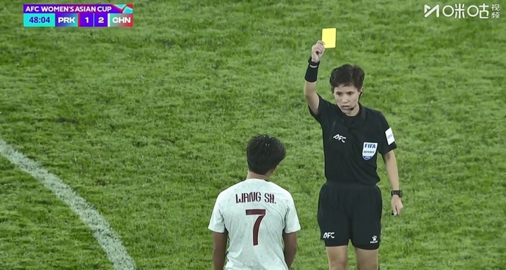 比賽第48分鐘,王霜帶球被斷隨后犯規(guī)拉住對手,吃到黃牌。