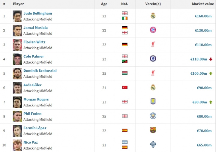 進攻型中場身價榜:貝林1.6億歐居首,索博1億歐超居萊爾升第五