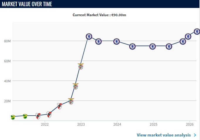 2023年1月,恩佐以1.21億歐轉(zhuǎn)會費加盟切爾西,自去年以來,恩佐的身價迎來三連漲,每次漲幅為500萬。