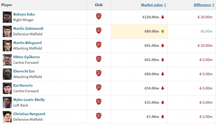 阿森納本期身價變動(單位:歐元):