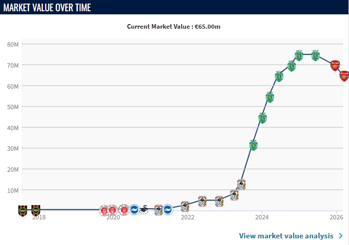 去年夏天,約克雷斯以6690萬歐轉(zhuǎn)會(huì)費(fèi)加盟阿森納,出戰(zhàn)38場(chǎng)比賽,貢獻(xiàn)15球2助,但身價(jià)已經(jīng)兩連跌,從7500萬歐跌至6500萬歐。