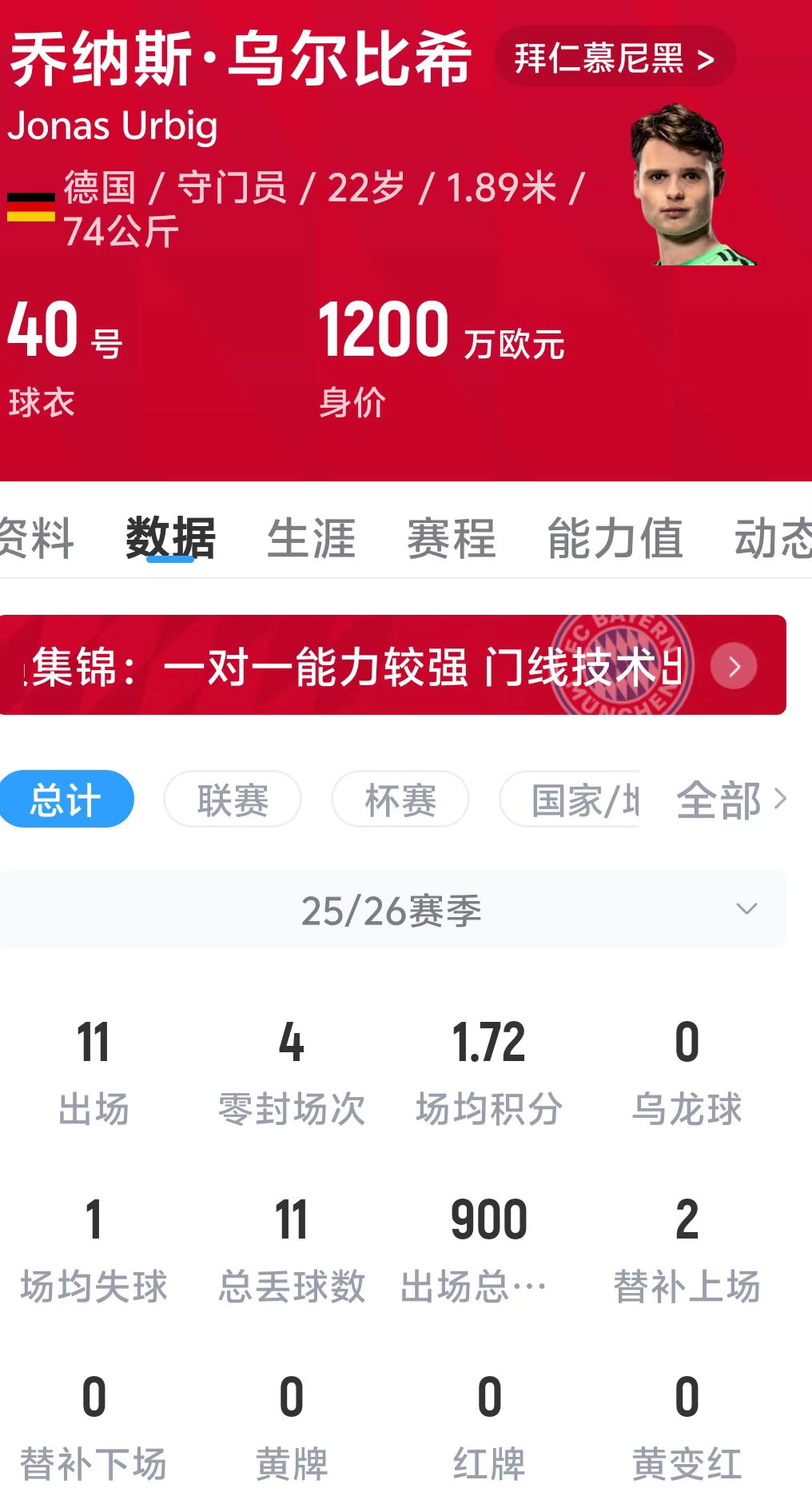烏爾比希,現(xiàn)年22歲,身價(jià)1200萬歐,為拜仁慕尼黑出場(chǎng)11次,零封4次,場(chǎng)均失球1粒,總丟球11粒。